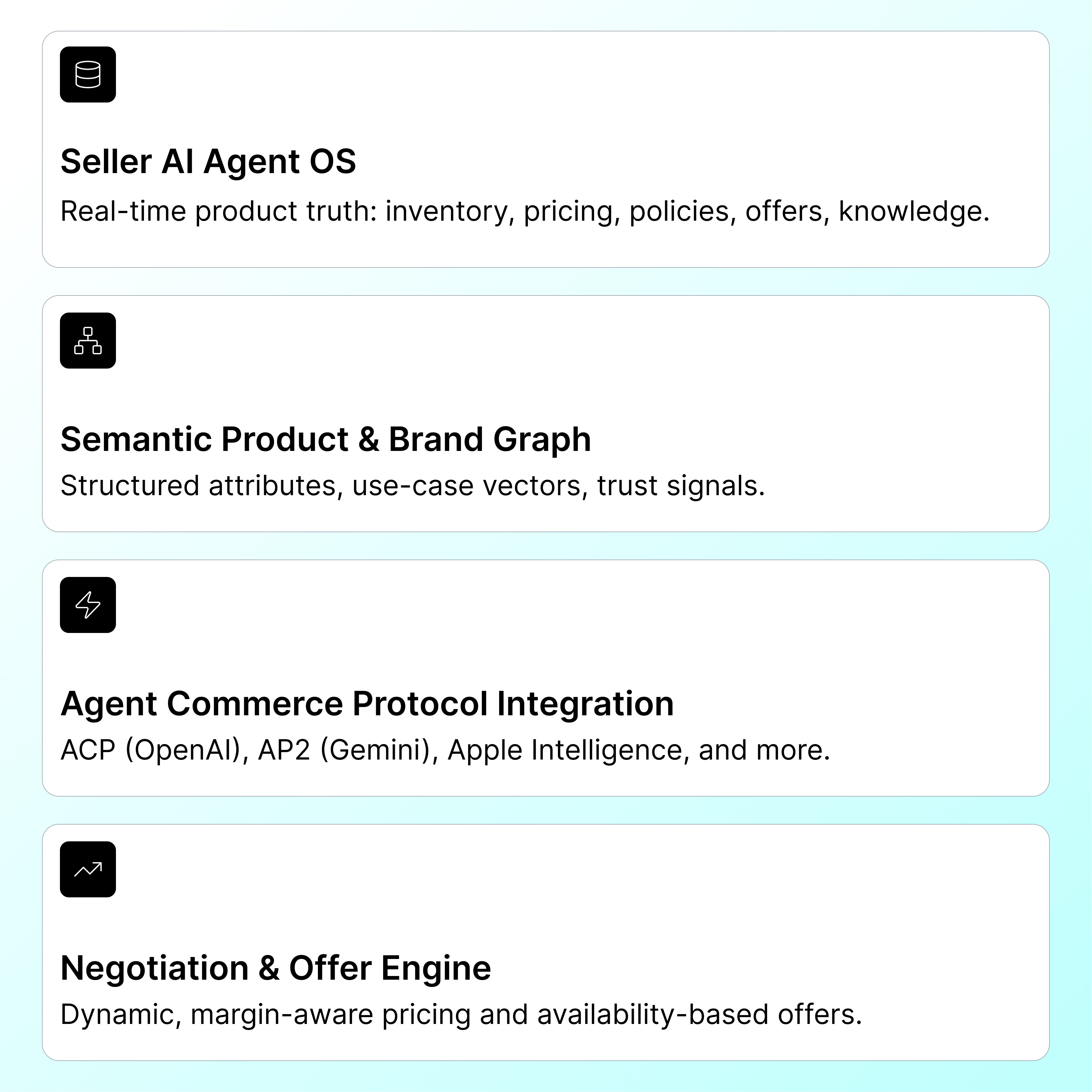 Be discoverable to AI Buyer Agents on ChatGPT, Perplexity, and Shopify through a single Seller AI Agent.